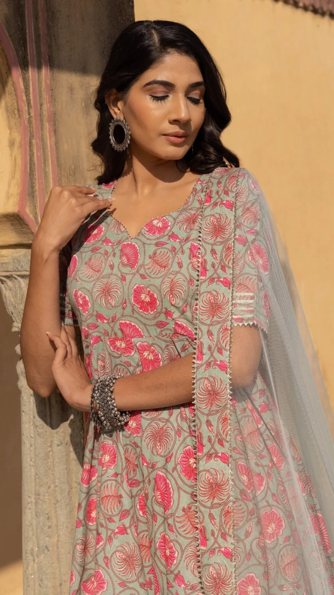 ALIZA HAND BLOCK PRINT COTTON ANARKALI SET WITH SOFT NET DUPATTA